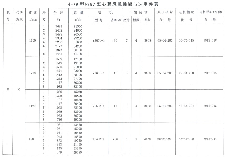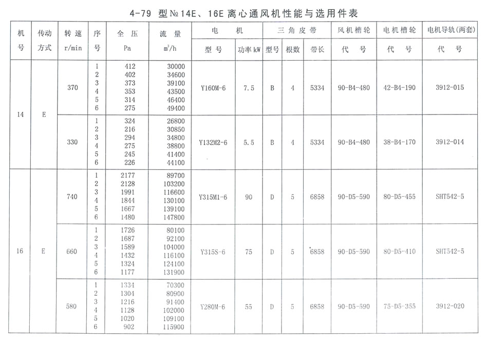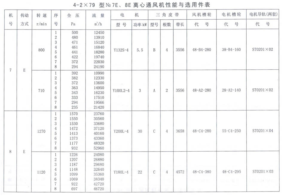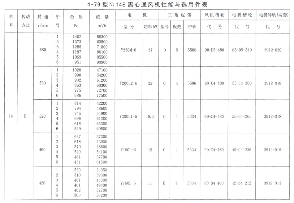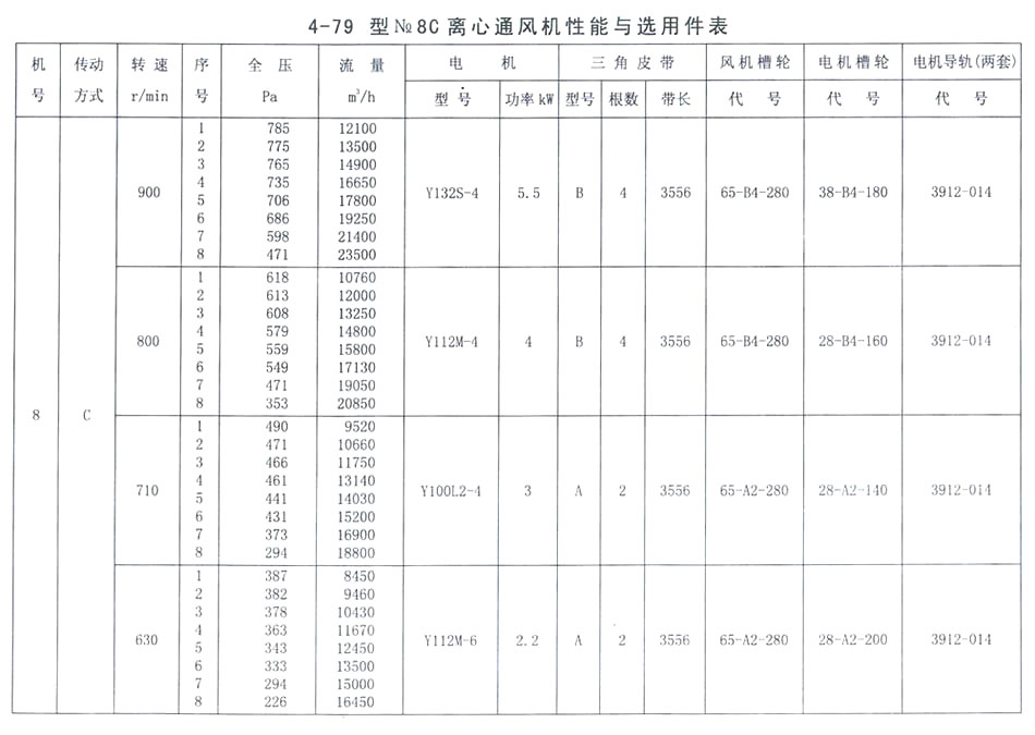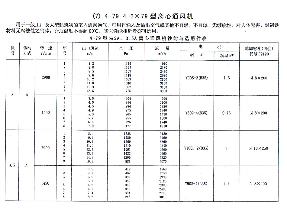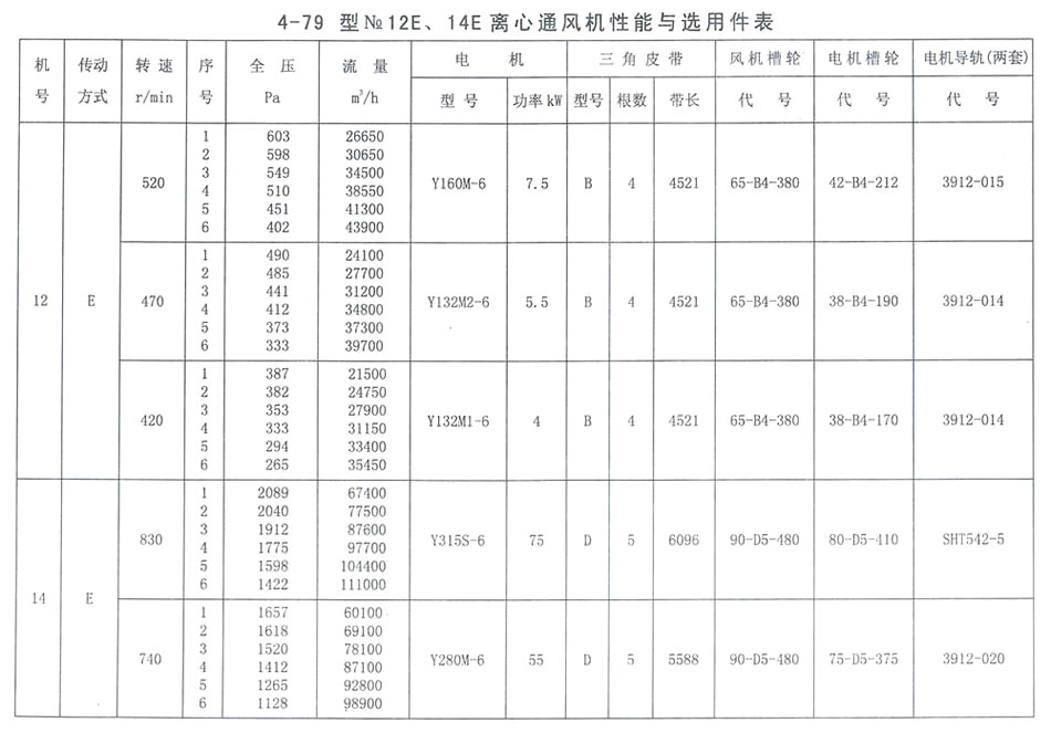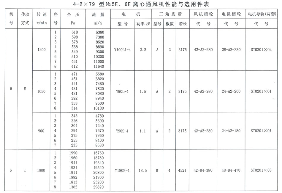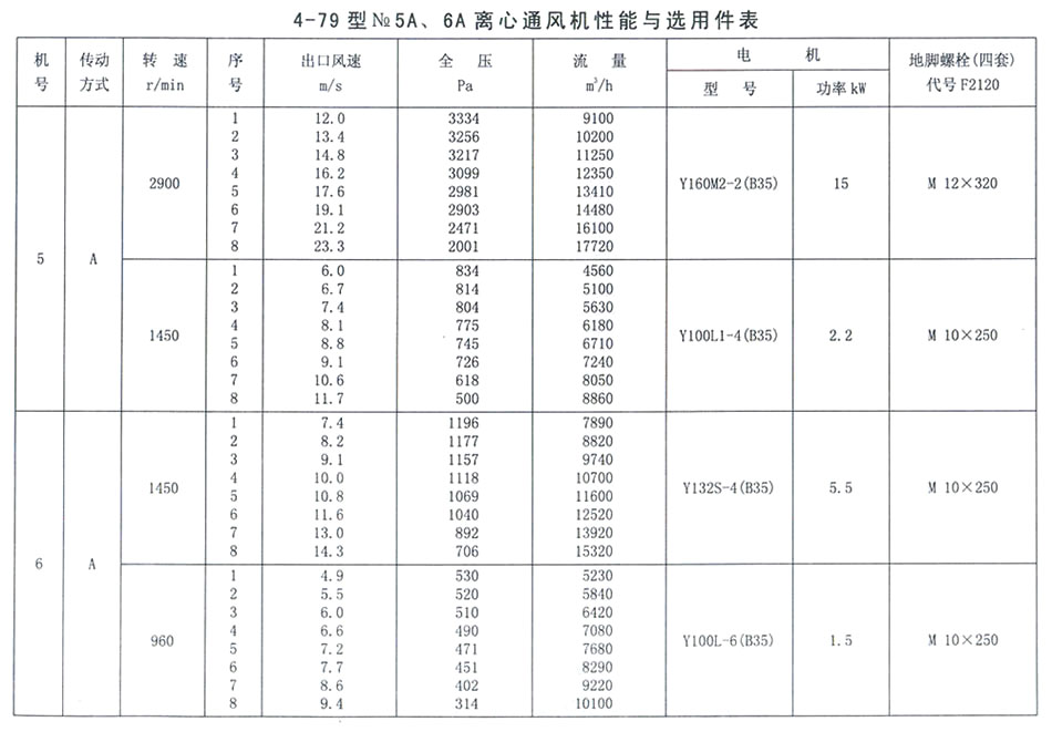 2、風機的出口位置,以機殼的出口角度表示。4-79型風機No3A~6A在出廠時均做成一種型式,使用單位根據要求再安裝成所需要的位置,出風口位置調整范圍0度~225度,間隔是45℃;No7C~8C出風口位置調整范圍0度~180度,間隔22.5度;No10E~20E單進風和雙進風出風口位置均制成固定大三種:0度、90度、180度,不能調整。如果您需要特殊機號、特殊出風口角度等非標準型號,我公司可為您設計和制造,但訂貨時需詳細注明。