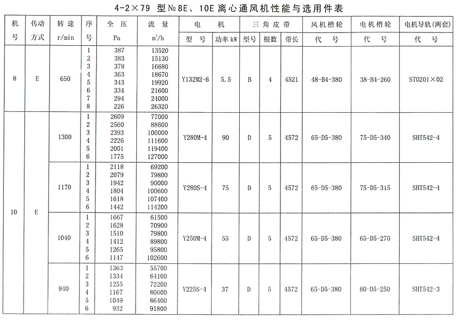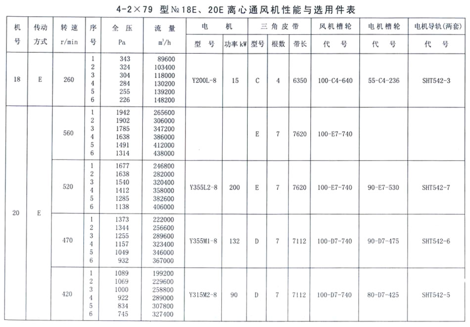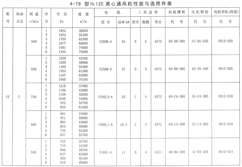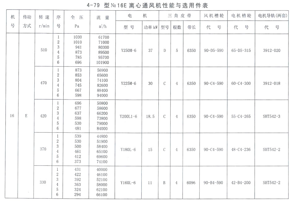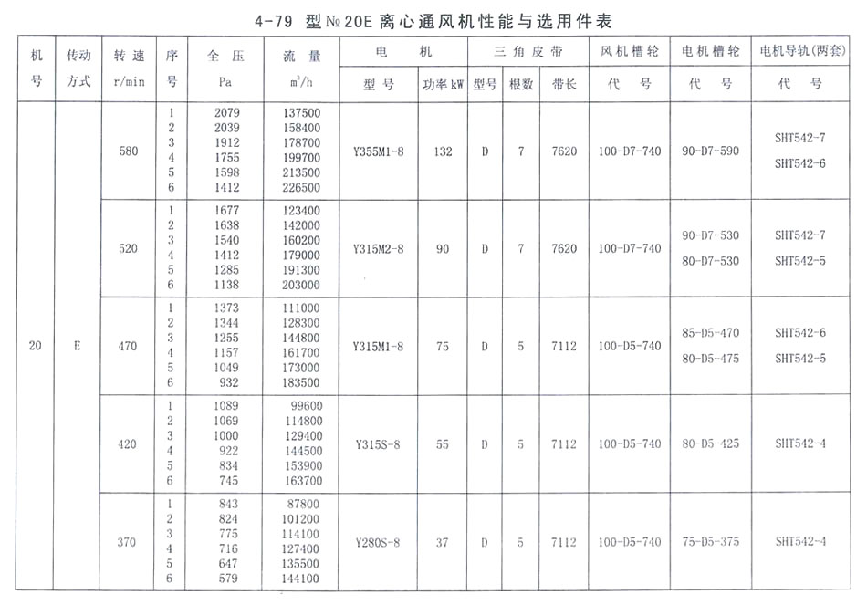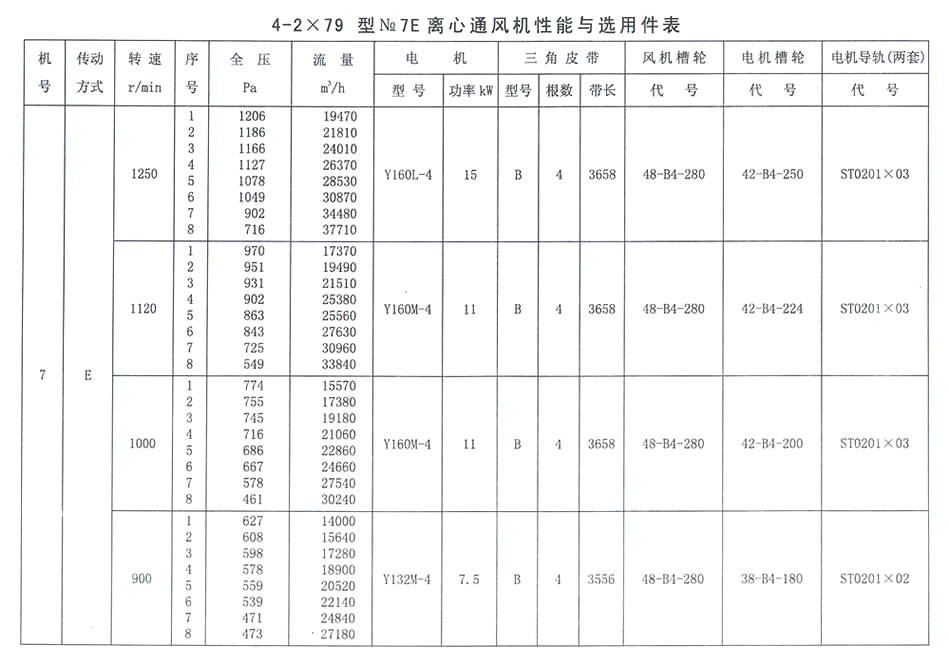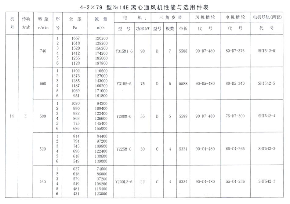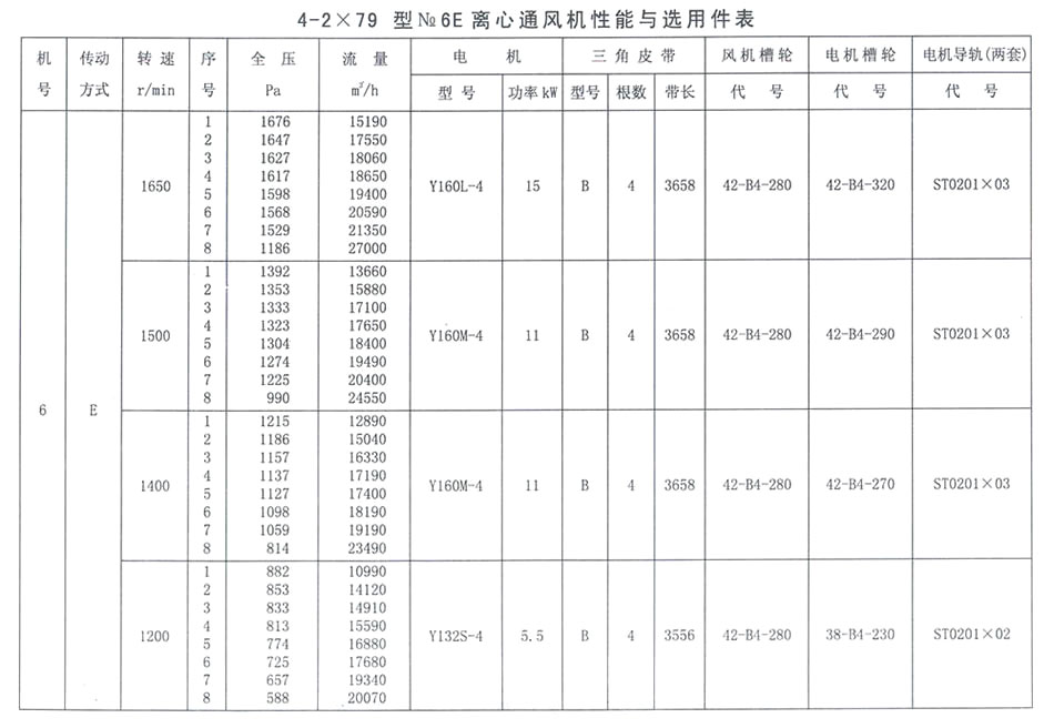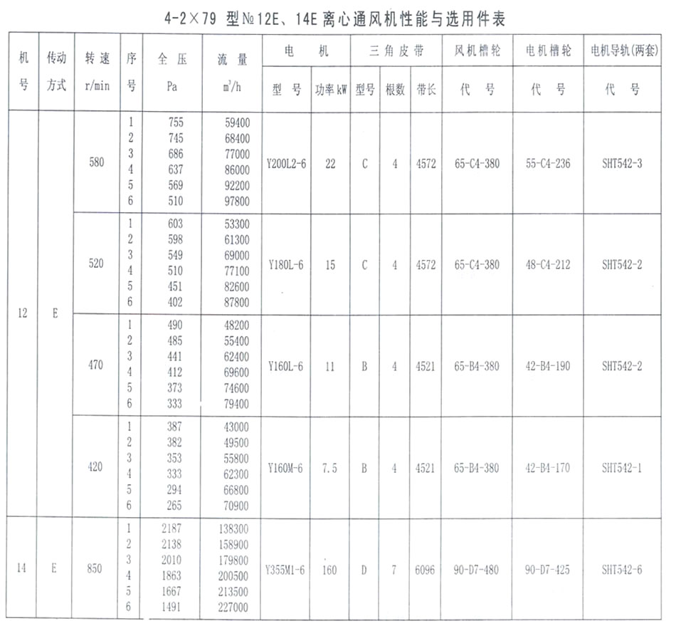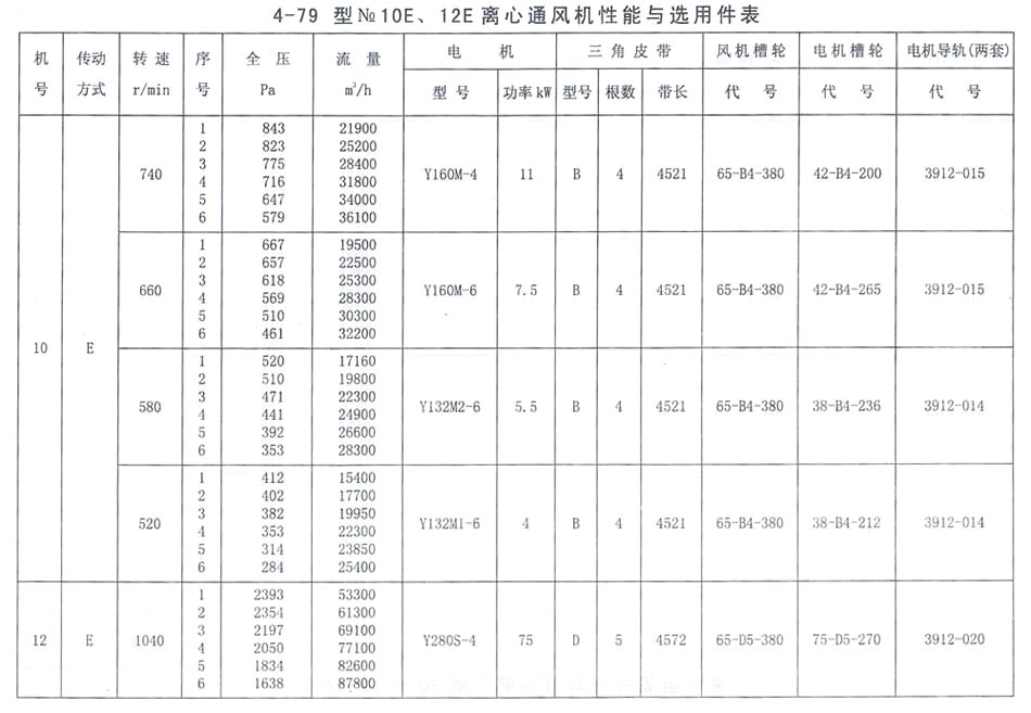 2、風機的出口位置,以機殼的出口角度表示。4-79型風機No3A~6A在出廠時均做成一種型式,使用單位根據要求再安裝成所需要的位置,出風口位置調整范圍0度~225度,間隔是45℃;No7C~8C出風口位置調整范圍0度~180度,間隔22.5度;No10E~20E單進風和雙進風出風口位置均制成固定大三種:0度、90度、180度,不能調整。如果您需要特殊機號、特殊出風口角度等非標準型號,我公司可為您設計和制造,但訂貨時需詳細注明。