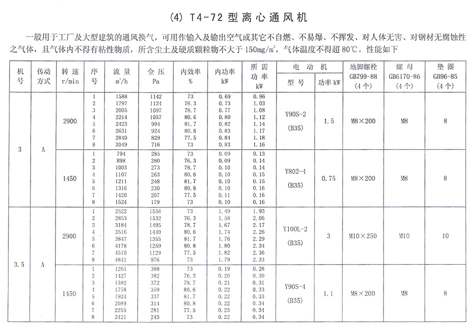 T4—72型離心通風(fēng)機(jī)可作為一般通風(fēng)換氣用,其使用條件如下: