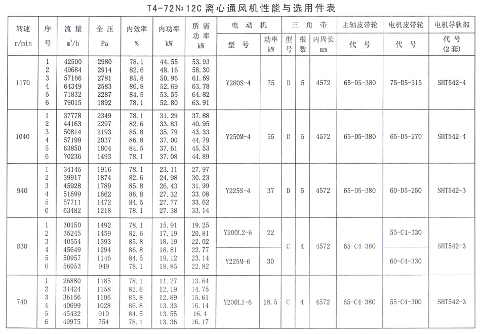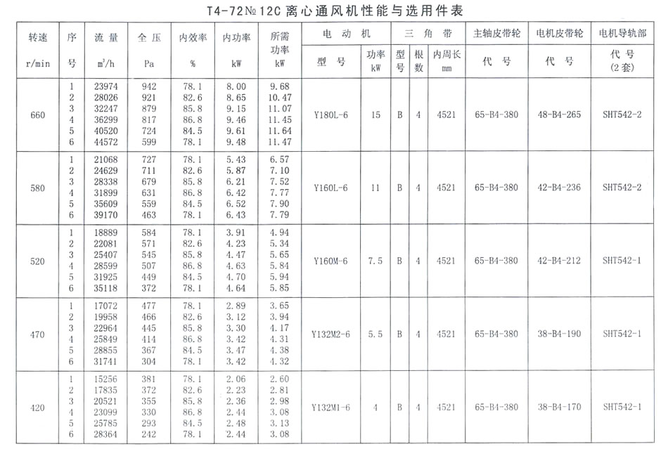 T4-72 No 12C離心通風(fēng)機(jī)性能與選用件表