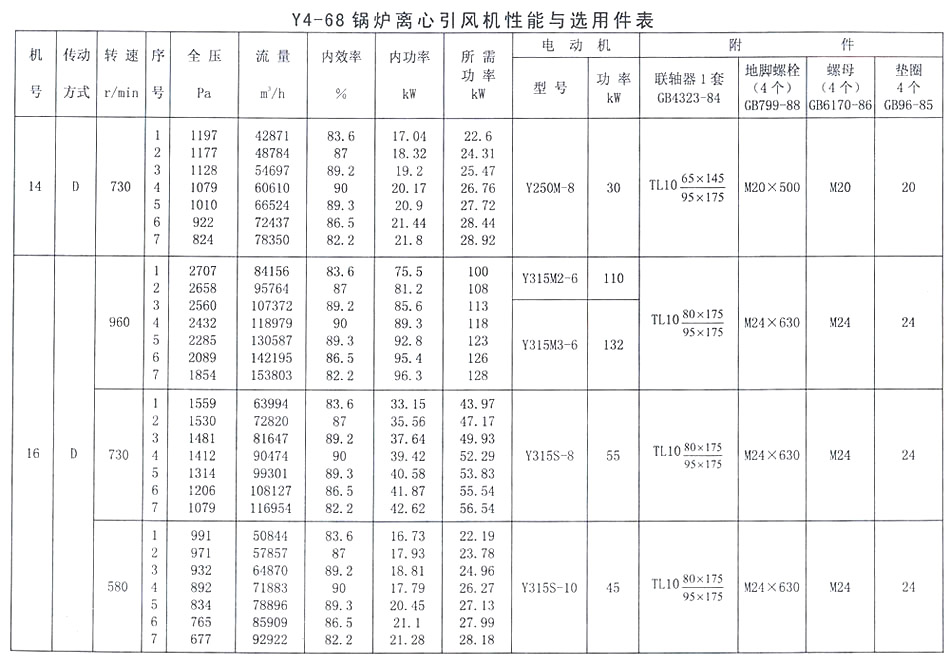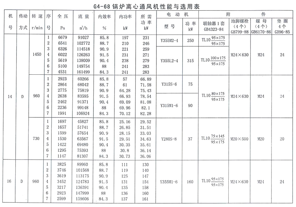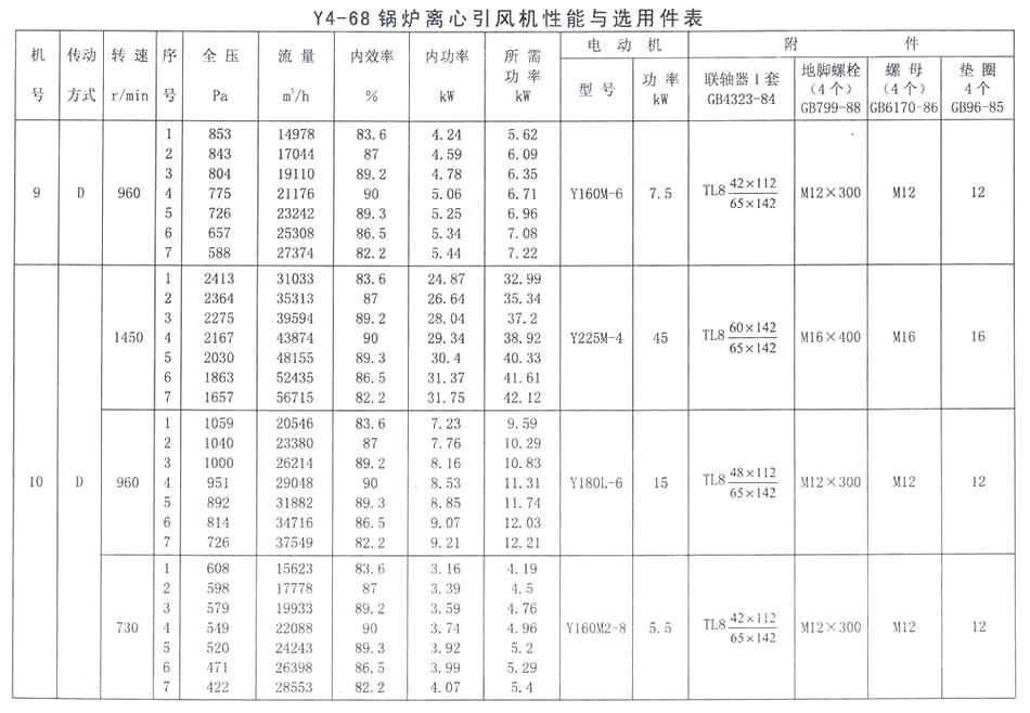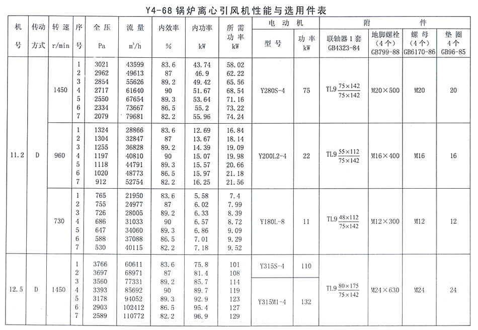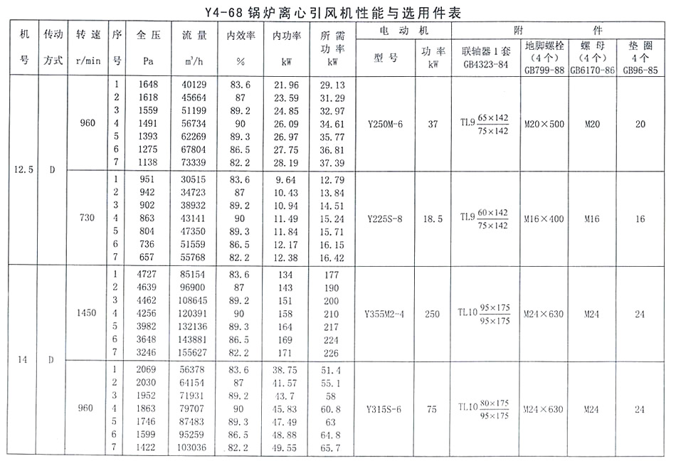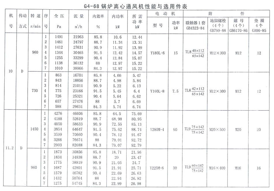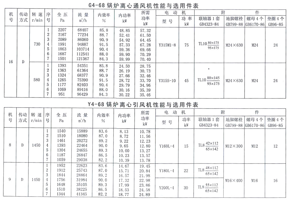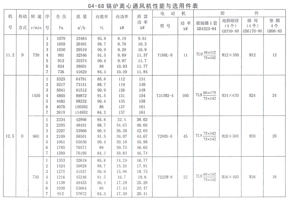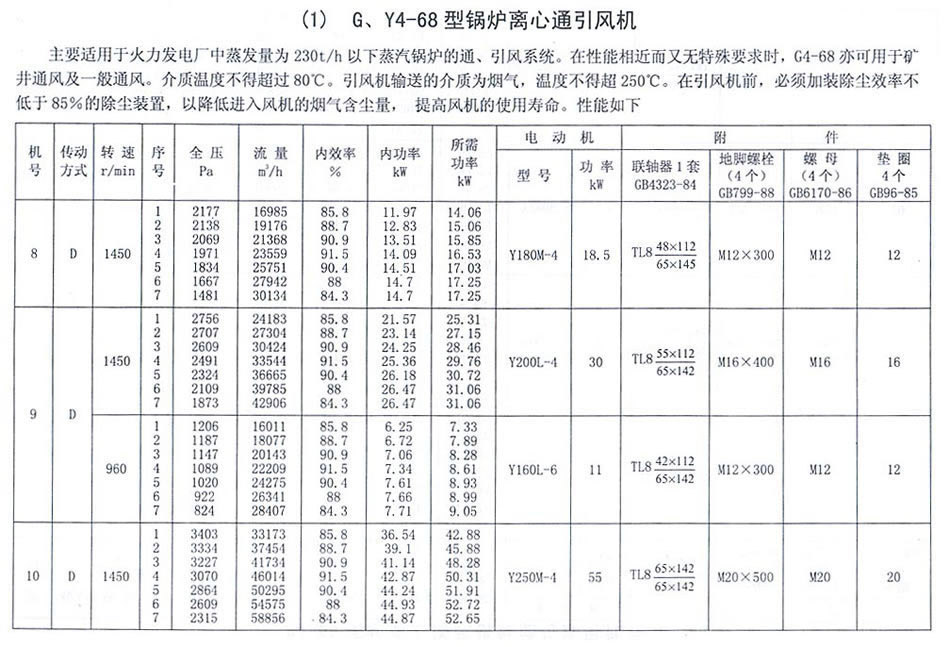 • G4-68 、Y4-68 鍋爐離心通風機性能與選用表