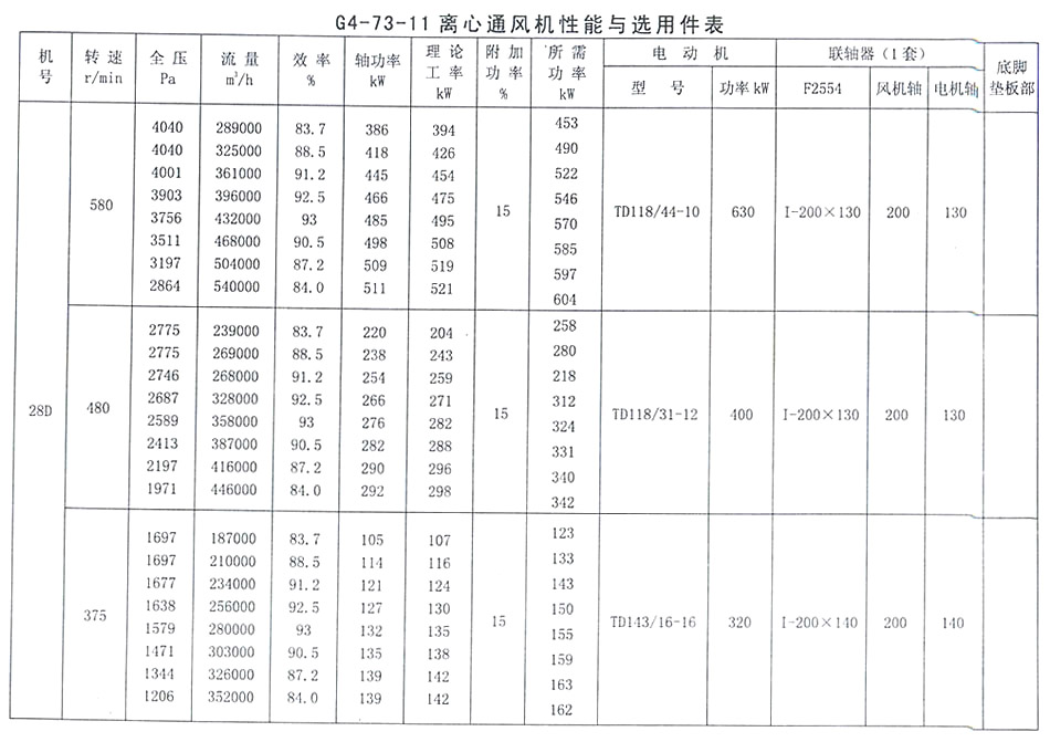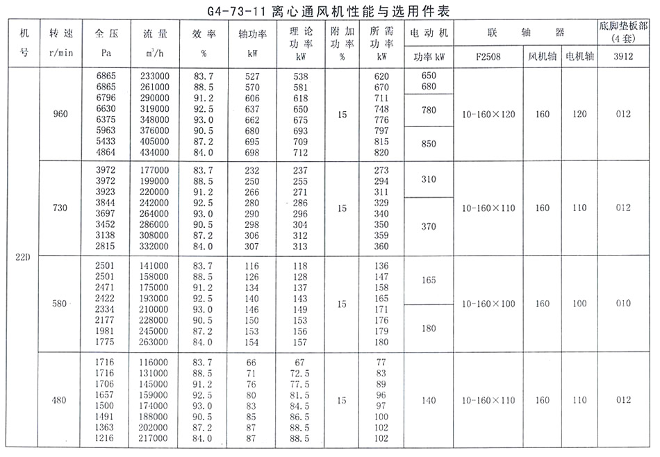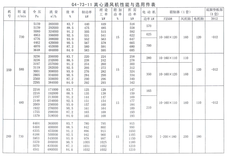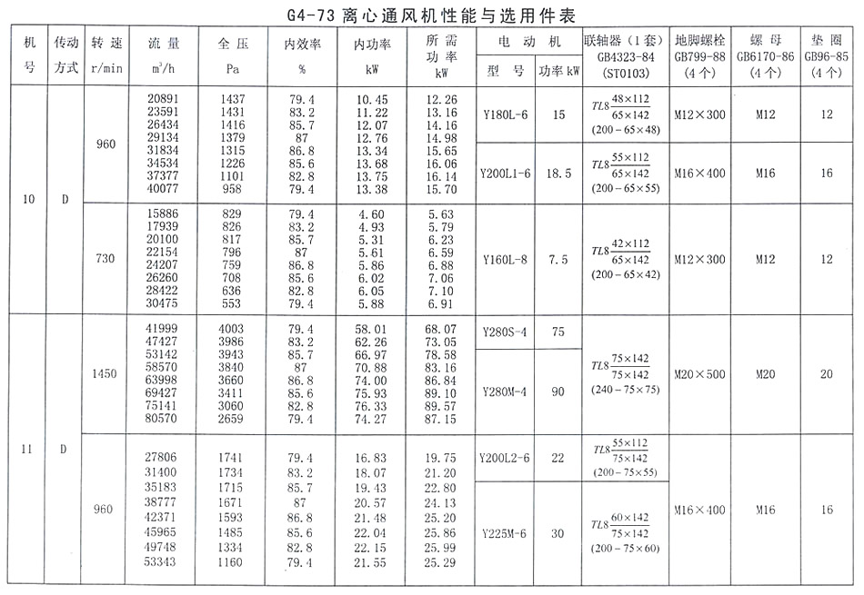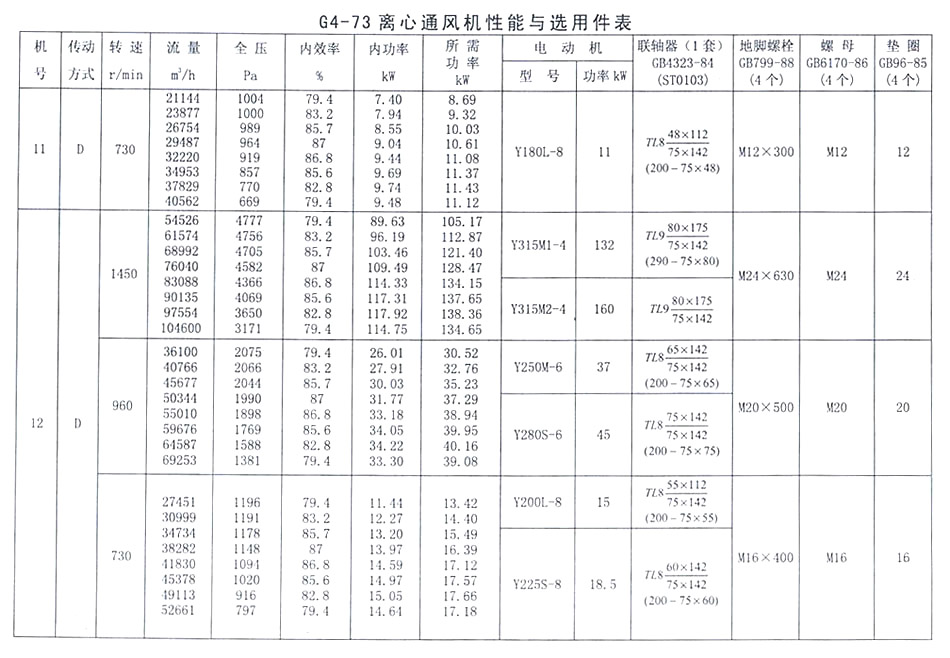 • G4-73-11 離心通風機性能與選用表