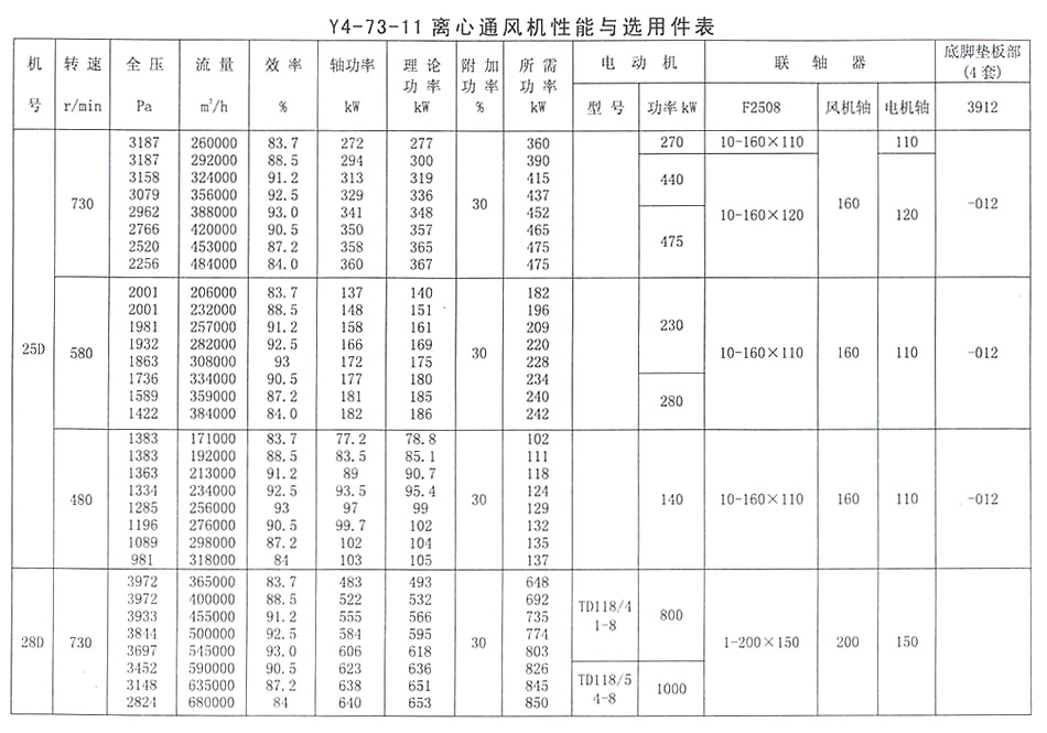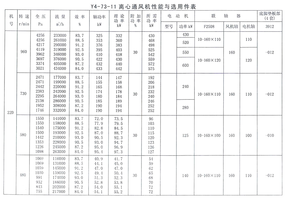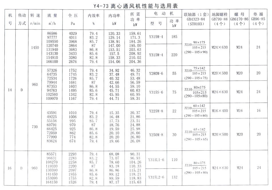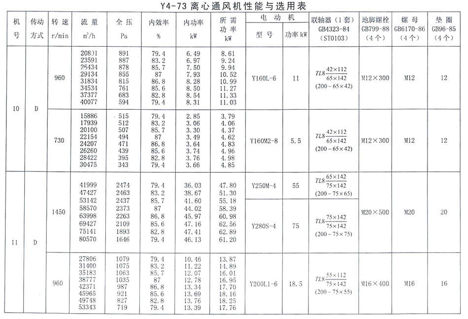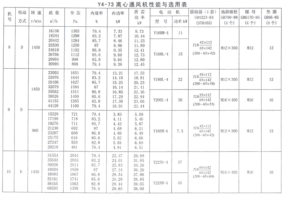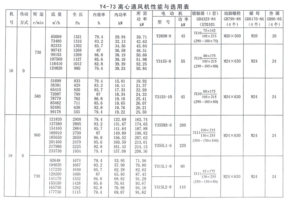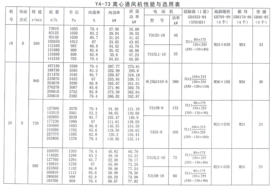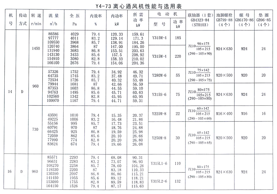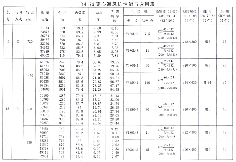 • Y4-73 離心通風機性能與選用表