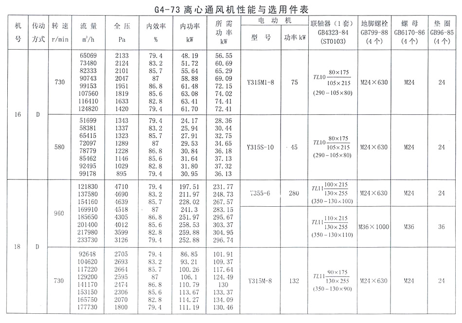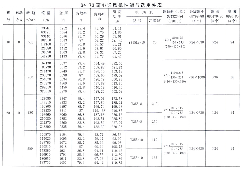 • G4-73 離心通風機性能與選用表