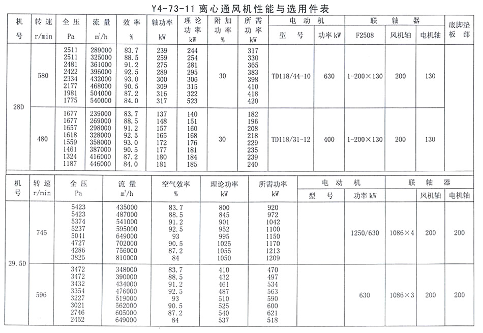 • Y4-73-11 離心通風機性能與選用表